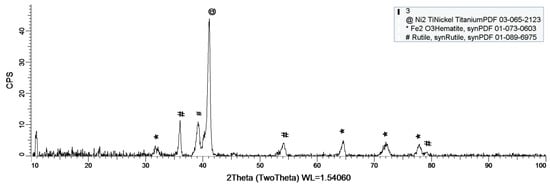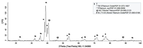 As it can be observed in Figure 8, nickel-titanium oxide (NiTiO3) forms on the surface as the sample is immersed in the SBF. The oxide is well represented on the sample’s surface, leading to the conclusion that it takes a while, but after its formation the oxide layer offers a protective interface between the SBF and metallic implant.
