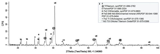 - XRD analysis used to establish if/what kind of oxides have formed on sample’s surface. Bruker D8Discover diffract-meter (Billerica, MA, USA) was used. The diffract-meter settings were as follows: primary optics uses Cu tube (λ = 1.540598 Å) and Göebel mirror while secondary optics uses 1D Lynx Eye detector (Bruker, Billerica, MA, USA). The plots have been recorded at 0.04° angle and 1 s/step scanning speed. They have been indexed using ICDD Release 2015 database (2015 release, International Center for Diffraction Data, Newtown Square, PA, USA).