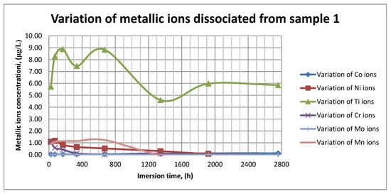 As it can be seen in Figure 11, Figure 12 and Figure 13, some of the metallic ions (mainly Ti) are released and/or consumed over time. The most probable hypothesis is that this behavior may be the result of the formation of protective oxide on the sample’s surface. It is well known that most of the metallic biomaterials rapidly form protective oxide layers when scratched. Nevertheless, the maximum amount of released metallic ions is still way lower that the amounts supported by the human body, as presented in Table 1. Thus, the released amount of Ti ions ranges from 5–10 µg/g, while the maximum allowed amount is 800 µg/day, so roughly 100 µg/L, and the concentration of Cr ions dissociated is roughly 1µg/L, while the maximum accepted amount is 28 mg/L, etc.
