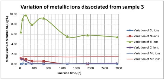 The corrosion rate is almost insignificant (×10−5) since its measure is grams over mm2 and week. Most of the implant materials are kept within the body for a maximum of 2 years (almost 100 weeks in very bad cases), and the overall corrosion rate can be declared as 4.3%. Also, the amounts of individual metallic ions is insignificant since the measured amounts range from ×10−6to × 10−4mg/L, and the allowed are ×101mg/L. The more important aspect is the release rate of Mn, but as Figure 11, Figure 12 and Figure 13 show, this release is only in the first 100 h of exposure, then the trend is constant and it can be considered that Mn turns passive after 3 days.