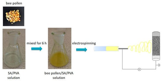 Scheme of the bee pollen-loaded SA/PVA electrospun nanofibrous mats fabrication by electrospinning.