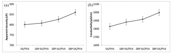 The process of electrospinning and the morphology of the electrospun nanofibers are influenced by solution parameters. Viscosity and electric conductivity are key factors [2,3]. Thus, before the electrospinning process, these parameters were determined. The electrical conductivity and apparent viscosity of the SA/PVA solution and SA/PVA solutions containing bee pollen are shown in Figure 2. The SA/PVA solution exhibited the lowest apparent viscosity of 801 cP. The addition of bee pollen to the SA/PVA solution increased the electrospinning solutions’ apparent viscosity. The SA/PVA solution with 3 weight % bee pollen concentration exhibited the highest apparent viscosity of 860 cP. The SA/PVA solution had the lowest conductivity at 1828 μS/cm, while the SA/PVA solution with 3 weight % bee pollen had the highest conductivity at 1998 μS/cm.