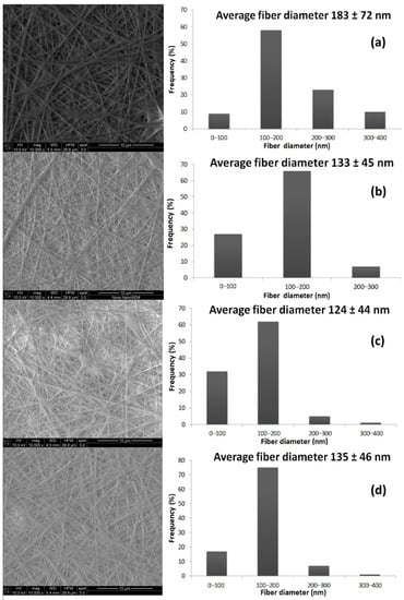 SEM images and fiber diameter distributions of the electrospun SA/PVA fibers obtained from (a) SA/PVA, (b) 1BP-SA/PVA, (c) 2BP-SA/PVA, and (d) 3BP-SA/PVA (×10,000).