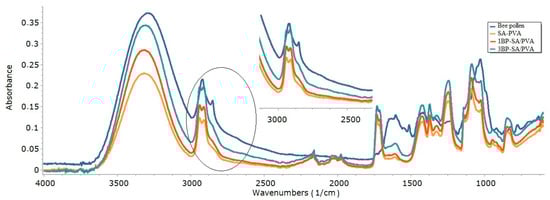 The FTIR-ATR spectra of the electrospun SA/PVA nanofibers changed after the addition of bee pollen, and the adsorption bands in the frequency range of 2880–2860 cm−1 were broadened due to CH stretching vibrations of different groups in bee pollen. The peak intensity of the stretching of –OH groups that occurs depending on the bee pollen concentration indicates the presence of bee pollen in the developed nanofibrous material.