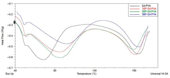 The thermal properties of the electrospun nanofibers were examined by differential scanning calorimeter. Glass transition and melting temperatures are two critical phenomena in polymers that are influenced by the materials’ processing conditions and additives. DSC analysis provides important information about phase transitions within materials [44]. The DSC thermograms of the electrospun SA/PVA and bee pollen-loaded SA/PVA nanofibers are presented in Figure 5. Three endothermic peaks were observed on the DSC curve of the SA/PVA as well as bee pollen-laded SA/PVA. The first relaxation observed at 50–60 °C, was due to relaxation in amorphous regions of PVA [44,45]. The second relaxation in the temperature range of 75–120 °C was caused by the glass transition temperature of the water evaporation [44,45] of PVA, and the third peak starting from 190℃ was due to the melting temperature of the PVA. These results are consistent with the literature [44,45,46]. The glass transition temperature (Tg) of the SA/PVA, 1BP-SA/PVA, 2BP-SA/PVA, and 3BP-SA/PVA nanofiber samples was determined to be around 76 °C, 95 °C, 101 °C, and 105 °C, respectively. When bee pollen was incorporated into the SA/PVA nanofiber, there was no sharp peak in the melting temperature of the sample. The melting temperature (Tm) of the SA/PVA, 1BP-SA/PVA, 2BP-SA/PVA, and 3BP-SA/PVA nanofiber samples was determined to be around 196 °C, 192 °C, 190 °C, and 196 °C, respectively.