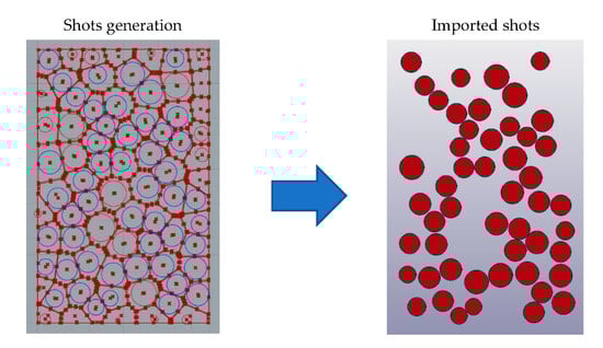 Shots used in industrial SP processes exhibit slightly varying diameters, with values lying in between a specific range, which depends on their type. Since every shot has a different diameter, it is necessary for the model to be capable of matching the size distribution of the S460 steel shots used in an industrial application. The abovementioned requirement led to the development of a python algorithm, which is based on the Voronoi tessellation method [16]. The specific process is illustrated in Figure 1.