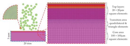 As shown in Figure 2, the specimen is divided in three areas with respect to the specimen’s height: the upper (“Top layers”) area, the bottom (“Core”) area, and another one in between (“Transition” area). The “Top layers” area is discretized with square elements having an edge length of 20 μm, the “Core” area again with square elements having an edge length of 100 μm, and the “Transition” area with quadrilateral and triangle-shaped elements with dimensions varying between 10 and 100 μm. The applied elements are two-dimensional shell elements with plane strain formulation for specimen and shots. The shots were also discretized using an element size of 20 μm. The mesh of a quarter of a shot is illustrated on the left-hand side of Figure 2.