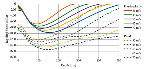 The solid curves in Figure 4 correspond to the results obtained with the elastic-plastic shots, while the dashed curves represent the ones of the rigid shots. In both cases, specific correlations between impact velocity, compressive residual stress, and peak depth occur: the increase in impact velocity leads to an increase in the maximum residual stress and its location (peak depth). This correlation has been identified and confirmed qualitatively in other studies, either experimental [30,31] or theoretical [32].