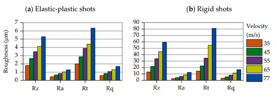 The left chart in Figure 5 has been derived from the elastic-plastic shot approach and the right one from that with the rigid shots. The different colors stand for the various velocities. The increase in the surface roughness parameters with increasing impact velocity is easily recognizable. This is because the higher velocity yields a larger amount of energy transferred to the specimen, causing deeper imprints. Comparison of the results obtained from the two approaches reveals remarkable deviations between them. As expected, the imprint of the rigid shots to the part’s surface is significantly larger, yielding higher roughness parameters. At the highest velocities of 77 and 65 m/s, the rigid shot approach leads to approximately 10 times higher roughness parameter values compared to those resulting from the elastic-plastic shot approach.