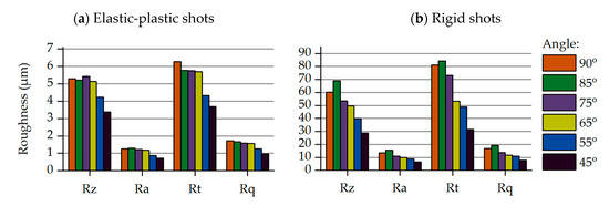 Following the same logic as the previous parametric study in Section 3.1, the selected roughness values have been compared for each impact angle for both approaches. The calculated roughness parameters are summarized in the bar charts shown in Figure 7. Decreasing the impact angle, meaning that the vertical component of velocity is decreased too, lowers the deformations induced on the part’s surface. This effect is clearly visible at impact angles ranging from 45 to 65 degrees, while this effect becomes smoother or even vanishes at higher angles. The use of rigid shots leads to extraordinary roughness parameter values, since they are not capable of absorbing any dynamic energy during the impact.