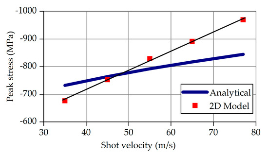 By simplifying the stress–strain curve of the target material into a bilinear one, the α ratio can be easily calculated. In addition, β which reflects the plastic over purely elastic contact radius, is assumed as 1. The other material parameters are known, both for the shots and the part. Therewith, the maximum compressive residual stresses at impact velocities V = 35–77 m/s can be calculated using Equation (5). The results are visualized and compared to the 2D model’s results in Figure 8.
