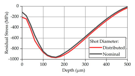 The necessity of modeling shots with a diameter distribution which matches one of the real shots has been investigated by FE simulations with shots having constant diameter equal to the nominal value of 1.4 mm. Notice that the number of the shots with nominal diameter differs from that with variable shot size. Equal in both cases is the total mass of the shots. In both simulations, the shots have a velocity of 77 m/s and an impact angle of 90°. The profiles of the calculated residual stresses are illustrated in Figure 9.