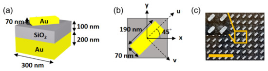 are the complex reflection coefficients for the u and v axes, respectively. To obtain the unchanged polarization of the reflected light, only the first term of Equation (1) is considered. Therefore, the dimensions of the nanobrick were adjusted to minimize