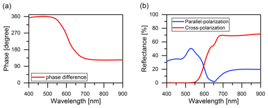 The phase difference in reflection is defined as the phase of the u-polarized light subtracting the phase of the v-polarized light (Figure 3a). It is assumed that the light is incident on the metasurface from the air. The phase difference approaches in the wavelength range from 700 to 900 nm, which satisfies the properties of a half-wave plate [35,36,37]. Due to the phase change, the direction of the rotation is opposite when circularly polarized light impinges on the half-wave plate. Therefore, the handedness remains unchanged between the reflected light and the incident light.