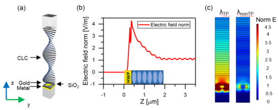 As shown in Figure 5, near-field analysis indicates that the strong electric field is localized at the interface [42] between the CLC and the metasurface at the resonance wavelength. In contrast, when the wavelength is nonresonant, the electric-field distribution acts as at an ordinarily-reflecting mirror. The maximum amplitude of the localized electric field at the resonant wavelength is approximately four times larger than that at a nonresonant wavelength. At any point inside the structure the mode has two running wave components with almost equal amplitudes. In Figure 5b, the electric field profile shows spatial ripples due to the interference between the running waves. The ripple period is half-wave. In contrast to a conventional Tamm mode, the interference makes no nodes or antinodes as both running waves are right-handed circularly polarized. In other words, every x-polarized node coincides with a y-polarized antinode and vice versa, which results in a smooth profile [30]. The nontrivial field profile in CLC was thoroughly investigated and illustrated in [43].