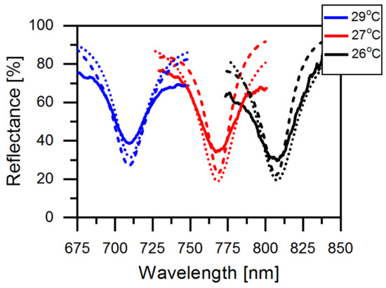 Reflectance spectra of the CLC–metasurface simulated by Berreman method (dotted lines); COMSOL (dashed lines) and experiment results (solid lines) by increasing the temperature from 26 C to 29