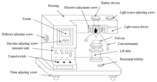The liquid and plastic limit tests were conducted using a GYS-2 photoelectric liquid-plastic tester from Nanjing Ningxi Soil Instrument Co., Ltd., in Nanjing, China. The liquid limit (LL) and plastic limit (PL) of the natural soil and RHA-reinforced soil samples were measured by the cone depth of the soil with the cone mass of 100 g and cone angle of 30 °C. Figure 1 depicts a schematic diagram of the photoelectric liquid and plastic limit testing apparatus used. The principle of the photoelectric testing method is based on the GB/T 50123-1999 standard soil test method and the JTG E40-2007 method of soil testing for highway engineering [39,40]. The sample was placed on the lifting table of the tester and the power was turned on so that the cone touched the specimen. The power to the electromagnet in the cone instrument was deactivated allowing the cone instrument to sink into the sample. The moisture content (wc) was measured corresponding to each cone depth (≤5 mm, 9–11 mm, and 20 ± 0.2 mm); thus, lines A and B in Figure 2 were plotted. The LL was determined from the test result as the moisture content at which the cone depth hp = 20 ± 0.2 mm. Using this LL, the cone depth hp was determined by Equation (1) [41]. The PL was then determined from Figure 2, based on the cone depth that was calculated from Equation (1) for each two straight lines A and B of a soil specimen.