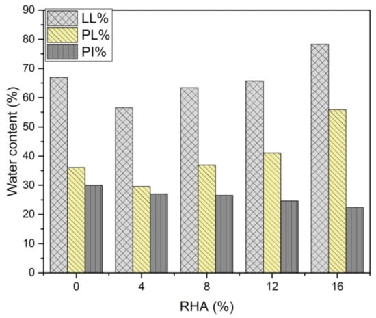 The photoelectric liquid-plastic limit illustrated the LL, PL and PI of the untreated and treated soil in Figure 3. Figure 3 illustrate that the increased of RHA content, the LL and PL decreased and then increased while the PI decreased. The LL of the natural soil was 67%, which increased to 78% at 16% RHA (increased 16%). Similarly, the PL of the natural soil was 37%, which then increased to 56% at 16% RHA (increased 51%). The PI of the natural soil was 30% and decreased to 22% when treated with 16% RHA (decreased 25%). A similar behaviour when used fly ash with clay soil was reported by Jianqiao et al. [41]. The observed that the decreased of LL and PL when RHA are first introduced in the soil could be attributed to the reaction occurring between the soil and the R H A leads to a flocculation and agglomeration of clay particles. The increase in the size of the soil particles takes place due to the agglomeration of the clay particles and consequently the LL and PL decreased. In general, consistency limits significantly influenced by many factors, such as the properties of soils, specific surface area, and chemical reactions. Clearly, the addition of RHA improved the stability of the soil by reducing the PI.