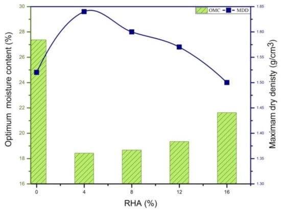- Adding RHA decreased the MDD of the clay soil specimens from 1.52 g/cm3 for the natural soil to 1.49 g/cm3 for soil treated with 16% RHA. The OMC decreased from 27.38% for natural soil to 21.63% for soil treated with 16% RHA.