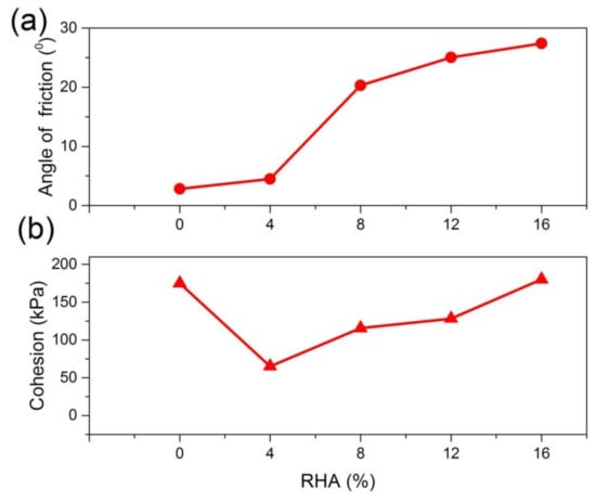 Figure 5 presents the shear parameters of the specimens with different RHA contents. Figure 5a shows that increasing RHA increased the maximum internal angle of friction (Φ) of the natural soil from 2.83° up to 26° with 16% RHA. A reasonable explanation for the increased observed in the angle of internal friction could be attributed to the increase in the size of the soil particles takes place due to the agglomeration of the clay particles when the soil particles interaction with RHA. Nabanita et al. [43] demonstrated that the angle of internal friction increased with increase in RHA content. Figure 5b indicates that the cohesion (C) of the soil decreased when RHA are first introduced in the soil this could be attributed to replacement of soil by the RHA and also to RHA reacted with soil which agglomerates the particles into a larger one. The maximum cohesion (C) of treated soil was 180.25 kPa obtained with the optimal RHA content of 16%. These results are similar to those reported in previous study [43,44].