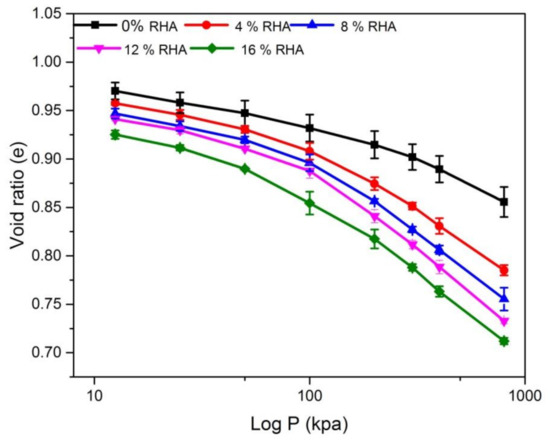 Zeng et al. [45] presented an important concept that compressibility, shear resistance and hydraulic conductivity are related to each other and represent the same physical phenomenon. Accordingly, a consolidation test was conducted using the oedometer provided data to analyse the variations of stress applied during the compression process with respect to compressibility and hydraulic conductivity. Previous studies on the compressibility of clay serve as a reference to evaluate the void ratio (e) of clay soil. To study the potential for consolidation, the void ratio (e) of untreated and treated soil was found as a function of effective pressure (log P, e), the results are represented in Figure 6. Figure 6 shows the void ratio with standard deviation of the treated and untreated soil. The void ratio and the compression curves of the treated soil plotted below the untreated soil curve: the void ratio decreased varying from 0.96 to 0.86 for natural soil and varying from 0.93 to 0.72 for treated soil with 16% RHA. The observed decrease in void ratio could be attributed to the RHA particles filled the pores and reduced the total porosity of the soil. Phanikumar and Singla [21] have shown that the equilibrium void ratio of natural soil is the highest, while the treated expansive soils have lower equilibrium void ratio when saturated after being submerged. Similar behaviour of clay slurries has been reported by Khan et al. [31].