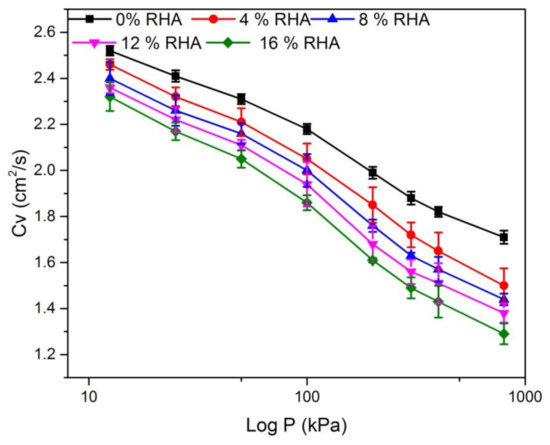 The relationships of log P consolidation pressure and the coefficient of consolidation (CV) for the soils treated with RHA are presented in Figure 7. The CV indicates the rate of consolidation of expansive soil is calculated using the void ratio from the compression curves in Figure 6. Figure 7 shows the coefficient of consolidation with standard deviation of the treated and untreated soil. Figure 7 illustrates that the CV decreased from a range between 2.52 cm2/s and 1.71 cm2/s for the natural soil to a range between 2.33 cm2/s and 1.30 cm2/s for 16% RHA. The observed decrease in CV is likely due to RHA causing tangles and frictional effects within the soil structure, and also due to the initial conditions of expansive soil (such as water content or void ratio), formation of a torsional flow path in the expansive soil, or the expansive soil intrinsic properties (such as specific gravity, particle size distribution, or mineral composition). Khan and Azam [30] also assert that with increased of effective stress, the CV behavior of the clay slurries decreased, while increased with the increased of (e) value.