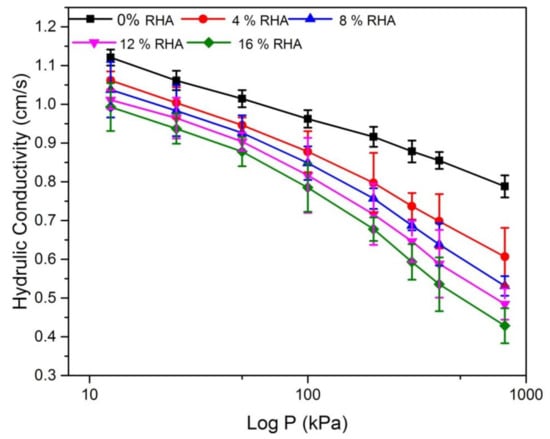 Similar to the e–log P pressure curve, it can be seen from the k–e curve shown in Figure 8. Figure 8 shows the hydraulic conductivity with standard deviation for the treated and untreated soil. It shows that the hydraulic conductivity (K) of natural soil specimen is higher than that of the treated soils. With the increased void ratio the hydraulic conductivity increased and decreased with the increased of RHA content, which corresponds to the contrast trend observed above for void ratio and consolidation coefficient. Within the study, the hydraulic conductivity of the natural soil ranged from 1.12 cm/s to 0.83 cm/s and the hydraulic conductivity of the treated soil ranged from 0.99 cm/s to 0.43 cm/s. As mentioned earlier, this decrease in hydraulic conductivity could be attributed to the RHA particles filled the pores and reduced the total porosity of the soil. Additionally, the scattering of soil particles at high void ratios contributed to more potential pockets of air in the sample, increasing hydraulic conductivity. These results are consistent with some previous studies [45,46].