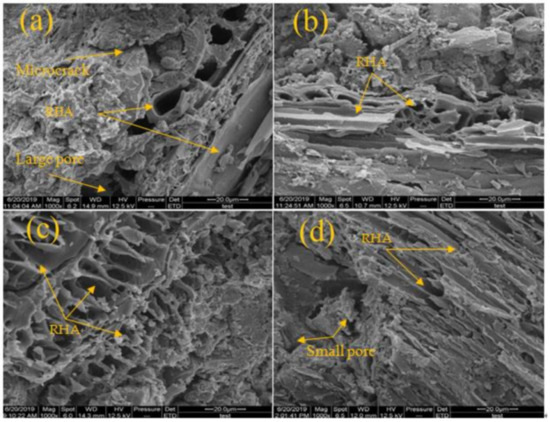 SEM micrographs (a) RHA 4% (b) RHA 8% (c) RHA 12% (d) RHA 16%.