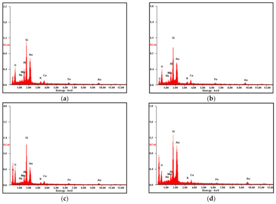 EDX diagram of treated soil with RHA (a) RHA 4%, (b) RHA 8%, (c) RHA 12%, (d) RHA 16%.