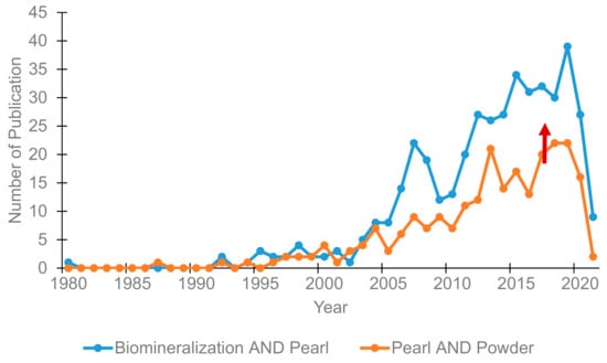 Number of publications per year from the Web of Science search for articles with topics of search terms “Biomineralization AND Pearl” and “Pearl AND Powder”, dated 16 April 2021.
