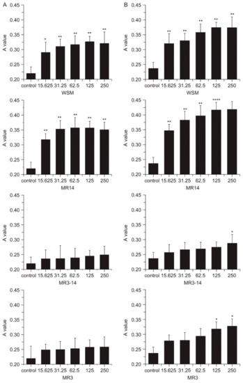 The water-soluble matrix (WSM) was extracted from pearl powder and size-fractionated using a 14 kDa cut-off dialysis tubing to give >14 kDa retentate (MR14), followed by a 3 kDa tubing dialysis to give 3–14 kDa retentate (MR3-14) and <3 kDa retentate (MR3). Effects of WSM, MR14, MR3–14, and MR3 on the growth of fibroblasts (μg/mL): incubation (A) after 2 days and (B) after 3 days. Reproduced from [49]. * p < 0.05; ** p < 0.01; **** p < 0.005.