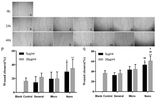 Different concentration and particle sizes of pearl powder and their effects on keratinocyte migration: (a) injury at 0 h; (b,i) control group; (c,j) pearl powders with concentration of 5 μg/mL; (d,k) pearl powders with concentration of 20 μg/mL; (e,l) micron-sized pearl powders with concentration of 5 μg/mL; (f,m) micron-sized pearl powders with concentration of 20 μg/mL; (g,n) nano-sized pearl powders with concentration of 5 μg/mL; (h,o) nano-sized pearl powders with concentration of 20 μg/mL. Statistical data of injury closure percentage in wound scratch assay in (p) 1 day and (q) 2 days, determined by Image J software (U.S. National Institutes of Health, Bethesda, MD, USA, v1.51 23 April 2018). Reproduced from [4]. (* p < 0.05, vs. blank control; ** p < 0.01, vs. blank control; ## p < 0.01, vs. general; & p < 0.05, vs. micro).