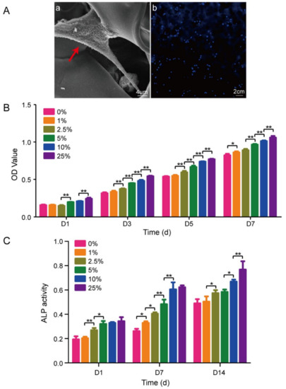 (A) SEM images: (a) cell morphology and (b) distribution of cells cultured on C-HLA/NPP scaffold after 4 weeks; (B) cell proliferation on scaffolds at day 1, 3, 5, and 7; (C) ALP activity of cells on day 1, 7, and 14. Reproduced from [70]. * p < 0.05, and ** p < 0.01.
