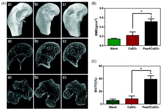 Post-implantation evaluation of repaired skulls. (A) 3D images of (a1–a3) control, (b1–b3) scaffolds from CaSO4, and (c1–c3) scaffolds from pearl/CaSO4; morphometric analysis of (B) bone mineral density, and (C) bone volume/total volume. Reproduced from [79]. * p < 0.01.
