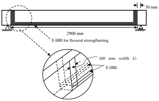 Two E-SBR strengthened RC beam specimens (SE-3A and SE-3B) were fastened at the end with 100 mm width of U-wrap by CFRP fabrics, as shown in Figure 2, to get rid of the premature peeling off (CFRP fabrics) failure of the specimens.