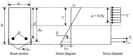The flexural load-bearing capacity of an E-SBR strengthened beam is computed from the compatibility of strain and equilibrium of forces as introduced in Figure 4.