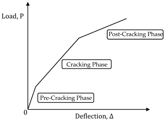 The load versus deflection graph of E-SBR CFRP fabrics strengthened RC beams can be divided into three different linear phases [23]. These three phases of the curve are plotted in Figure 5. However, the model does not conceive the influence of delamination of CFRP fabrics in the E-SBR technique on the prediction of the deflection curve.