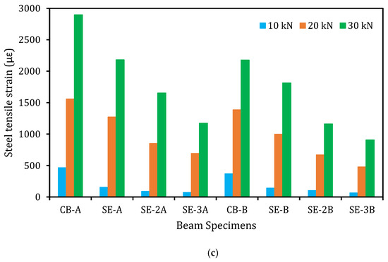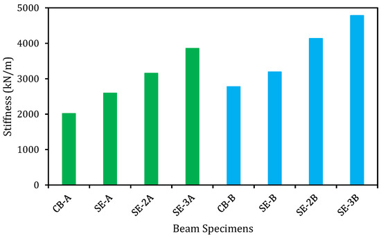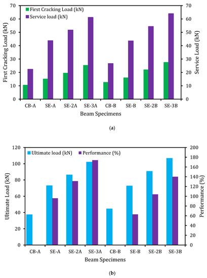 The first cracking load is vital as the flexural stiffness reduces due to the formation of the first crack [25,26]. In this research work, it was found that the first cracking load increased up to 141 and 118% for the series of strengthened specimens A and B, respectively, compared to the control beam as revealed in Figure 6a. This could be attributed to the enhanced pre-cracking stiffness by the side-EBR technique with CFRP fabrics.
