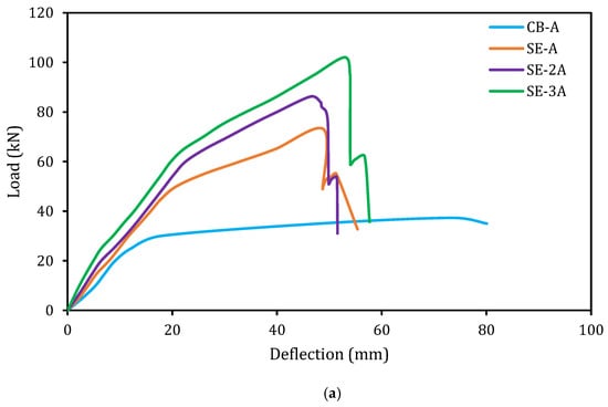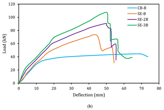 The load versus deflection graphs for the reference (CB) and E-SBR strengthened beams are exhibited in Figure 7 (series-A and series-B with different main reinforcement ratio). The characteristics of the strengthened beams are enhanced compared with the un-strengthened beam (CB). However, the new strengthening E-SBR technique delays the opening and growth of cracks of the strengthened beams. The first crack of the strengthened beams is initiated at higher load with lower deflection. The E-SBR strengthened beams show three distinct stages of load–deflection behavior. The first stage comprises of the almost linear load–deflection curves, which represent uncracked beams due to the high bending stiffness of the specimens. In the second stage, cracks formation and propagation have reduced the stiffness of the specimens. However, the linear characteristics of the specimens were also perceived. The cracking load of the control beams is 10.50 and 12.60 kN, whereas the strengthened beams cracking load varied from 15.10 to 25.30 kN and 16 to 27.50 kN for series A and B, respectively (Figure 6a). The third stage of the load–deflection curve was initiated owing to the yielding of the steel reinforcement. The yielding loads of steel for the two control beams were found as 30 and 35 kN, whereas for the strengthened beams, these loads ranged from 45 to 65 kN and 50 to 70 kN for series A and B, respectively. It has been noticed that the bending stiffness of all beams reduced at this stage. The rate of reduction of the stiffness depends on the concrete cracking due to yielding of both the main reinforcement and the strengthening fabrics. The rate of reduction of the stiffness of the strengthened beam was found lower compared with the CB and this could be due to the contribution of the side strips of CFRP fabrics that enhanced the flexural performance.