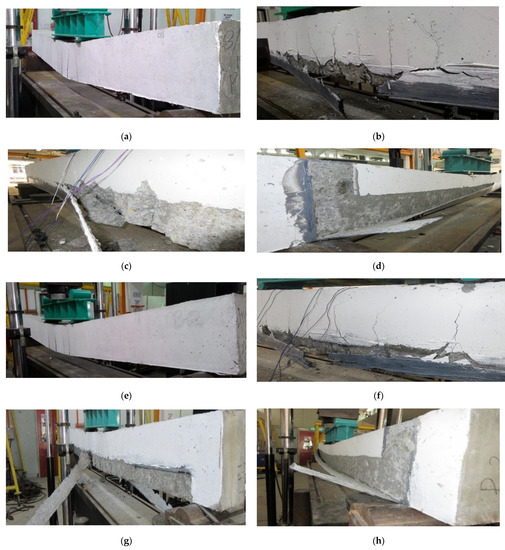 Failure modes of the beams; (a) CB-A; (b) SE-A; (c) SE-2A; (d) SE-3A; (e) CB-B; (f) SE-B; (g) SE-2B; (h) SE-3B.
