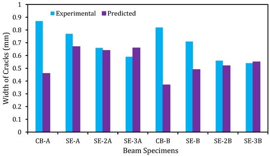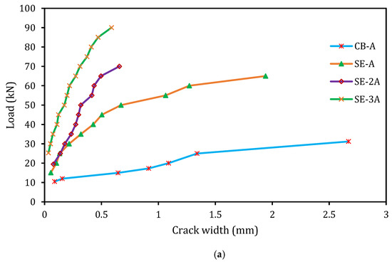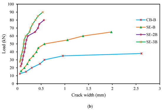 In this study, the crack width of the beams was enumerated utilizing Dino-Lite (TMS-AM73115MTF) digital microscope at the load increment of 5 kN. The correlation between the applied load and crack width of the control and strengthened beam specimens are exhibited in Figure 9. As known, the cracks occur in the beam specimens as the concrete tensile stress exceeds the limiting tensile strength of concrete. Initially, the stress in the concrete progressively developed via the bond strength among the concrete and the reinforcements. Once the stresses in the concrete increases and over the tensile strength of concrete, then new cracks form [32]. As expected, the first flexural crack was initiated at the constant bending regions of the beam specimens. The load–crack width graphs (Figure 9) expressed a linear increment of crack width until the yielding of the reinforcement and after that, the width of crack increased rapidly. However, the strengthened specimens exhibited a lesser width of cracks. Table 3 shows the number and the mean spacing of cracks of the beams.