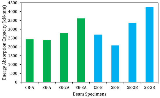 Before failure of the RC beams, the specimens are expected to absorb the energy. This characteristic is very crucial for the design of structures considering the aspects of the earthquake. The energy absorption capability of the beam specimens is assessed by the total area underneath the load versus deflection graph [35,36]. Figure 10 graphically represents the energy absorption capacities of the control and strengthened beams. The E-SBR strengthening technique with CFRP fabrics successively increased the energy absorption capability compared to the control beams. The first and second series of the beams exhibited an enhancement of energy absorption capability of 49 and 58%, respectively, due to enhancing the flexural capacities of the beams strengthened with of CFRP fabrics.