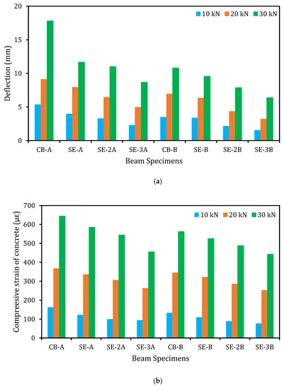 The flexural performance of the strengthened beams compared to the control beam is exposed in Figure 6b. The RC beams strengthened with side-EBR technique utilizing CFRP fabrics significantly increased the flexural performance. The beams with E-SBR CFRP fabrics and end anchorage increased the flexural load capacity up to 174 and 140% correspondingly, compared to the control beam. Thus, the higher flexural load-bearing capacities of the strengthened beams of this research could be compared to the beams strengthened with existing EBR system using 1.40 and 4.78 mm thickness of CFRP sheets, which shown the ultimate load increment of 42 and 58%, respectively [30].