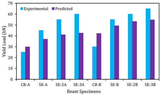 The yielding load (Py) of the E-SBR strengthened beams was calculated by considering the elastic limit of steel rebars. The yield load is calculated based on Equations (1)–(7).