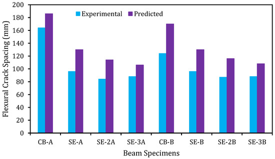 The prediction of flexural crack spacing and width of the control and strengthened beams calculated using equations as stipulated in the Euro-code 2 [22] was founded on the modular ratio of the main steel rebars and CFRP fabrics and the position of the neutral axis (N.A.) of the strengthened beam cross-section. The crack spacing and width of the E-SBR CFRP fabrics strengthened beams are calculated using Equations (13)–(19).