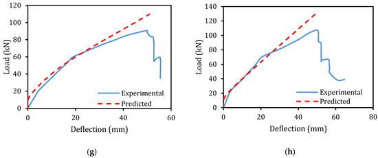 In the cracking phase, the section of the beam does not comprise a constant moment of inertia. Thus, an effective moment of inertia (Ie) of the section is used for the calculation of deflection. The effective moment of inertia (Ie) is greater than the cracked moment of inertia (Icr) and less than the gross moment of inertia (Ig), which depends on the crack’s propagation, load, and tensile resistance of the concrete. The most accepted equation for estimating the effective moment of inertia (Ie) was developed by Branson [24] and is given in Equation (21). In this phase, the deflection is evaluated using the Equation (22).