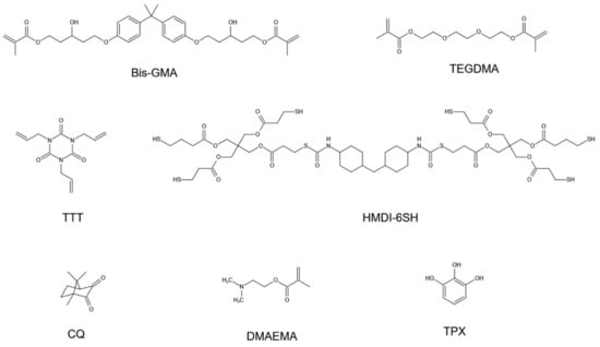 - Lu, H.; Carioscia, J.A.; Stansbury, J.W.; Bowman, C.N. Investigations of step-growth thiol-ene polymerizations for novel dental restoratives. Dent. Mater. 2005, 21, 1129–1136. [Google Scholar] [CrossRef]