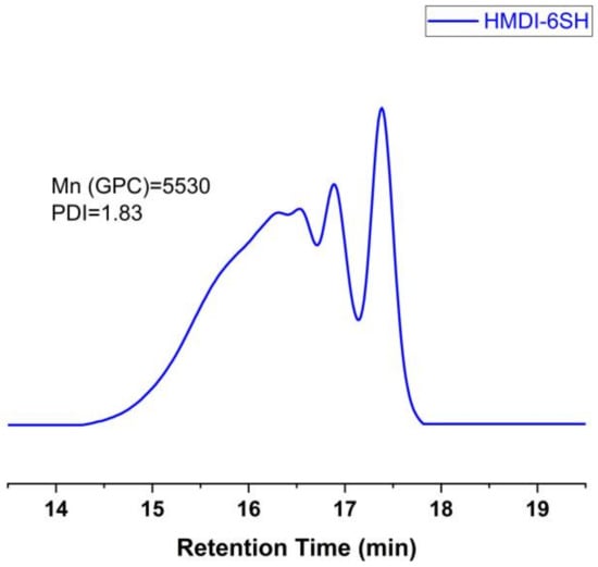 Hyperbranched oligomers do not have an accurate chemical structure with polydispersity compared to their dendritic molecules, but their synthesized process is easier than dendritic molecules without a tedious purified process. We synthesized HMDI-6SH using thiol-isocyanate click reaction via one-pot without further purification. Thiol groups can react with isocyanate groups quantitatively with Lewis bases in a dipolar solvent such as dimethyl sulfoxide (DMSO) or acetonitrile (ACN). After the reaction competition, the peak at 2230 cm−1 attributed to -NCO group in FT-IR spectrum was disappeared accompanied with the appearance of -SH group at 2560 cm−1. The chemical structure of HMDI-6SH had been confirmed by FT-IR (Figure 3) and 1H-NMR (Figure 4) spectrum. The average number of molecular weight (Mn) of HMDI-6SH was 5530 and PDI was 1.83 (Figure 5).