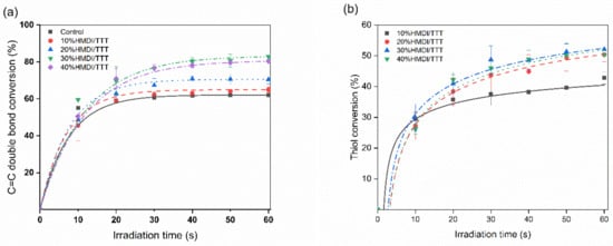 High final functional groups conversion for dental monomers was beneficial to the long-term material properties of dental resin systems [26]. The degree of functional groups conversion was usually monitored by real-time FTIR technology. Figure 6 showed the degree of conversion (DC%) versus irradiated time curves of methacrylate and thiol groups. It could be observed that the DC% for these two functional groups increased obviously for the first 20 s irradiation time, and the variation became slower after 20 s.