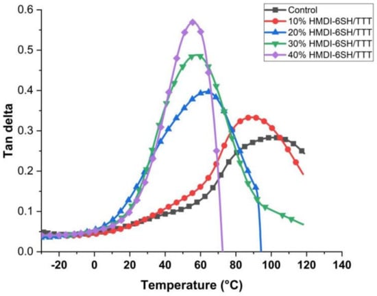 As shown in Figure 7, the Control group exhibited one broad peak at around 100 °C, suggesting that it was a heterogeneous polymeric network. With the concentration of HDMI-6SH/TTT thiol-ene monomers system increased, the peak of tan δ was narrowed, it was attributed to the step-growth reaction process of thiol monomers with methacrylate monomers (Bis-GMA or TEGDMA) and ene monomer (TTT) to obtain the more homogeneous network [28]. Simultaneously, the deceasing tendency of Tg was observed as given in Table 4. It was resulting from the lower crosslink density due to chain transfer reaction to thiol from ene monomer to reduce the molecular weight of the polymer and high flexible thioether moieties incorporated into the polymer network [29].